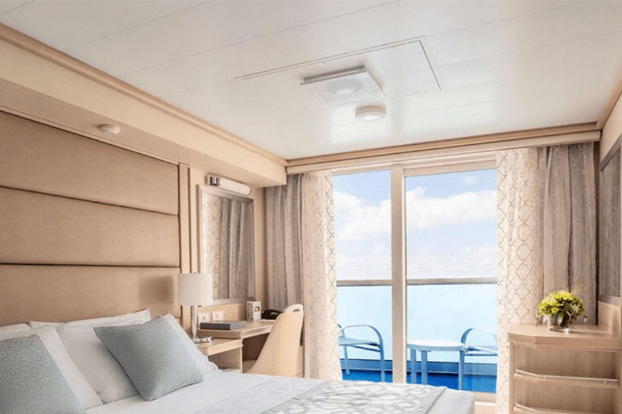 Le cabine con balcone offrono una spaziosa sistemazione con un balcone privato per godersi la vista sull'oceano e l'aria fresca. Con un tavolo e sedie sul balcone, è il luogo perfetto per rilassarsi e ammirare il paesaggio marino. Queste cabine offrono anche un'ampia varietà di comfort e servizi per un soggiorno piacevole.